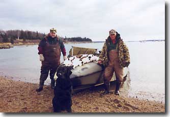 Come hunt the picturesque Maine Coast where Eiders, Oldsquaws and Scoters winter in amazing numbers. With a limit of seven birds per day a selective drake shooting is practiced to ensure population growth. The duck hunting style at Penobscot Bay Outfitters is set up with the trophy hunter in mind. We will be set up to hunt at the opening of legal shooting time to sunrise. This will give us the chance at seeing the morning flights of Sea Ducks and Puddle Ducks. After the morning sea duck hunt we often go right to Puddle Duck hunting if the hunters would like to hunt for Black Ducks, Goldeneyes, or some of the other diving ducks Maine has to offer. |